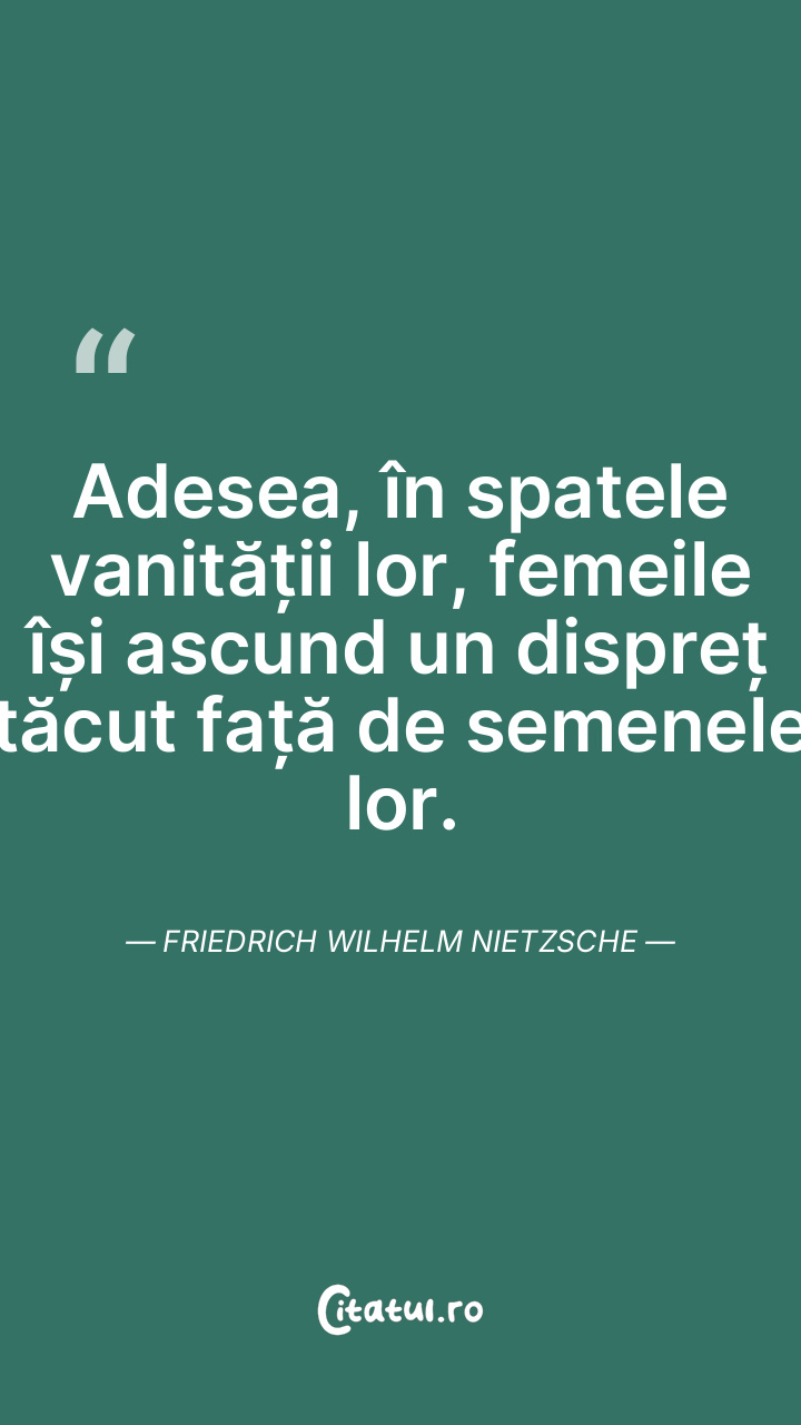 Adesea, în spatele vanității lor, femeile își ascund un dispreț tăcut față de semenele lor. Friedrich Wilhelm Nietzsche