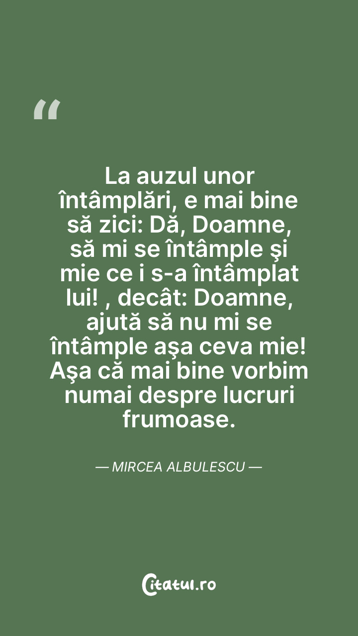La auzul unor întâmplări, e mai bine să zici: Dă, Doamne, să mi se întâmple şi mie ce i s-a întâmplat lui! , decât: Doamne, ajută să nu mi se întâmple aşa ceva mie! Aşa că mai bine vorbim numai despre lucruri frumoase. Mircea Albulescu