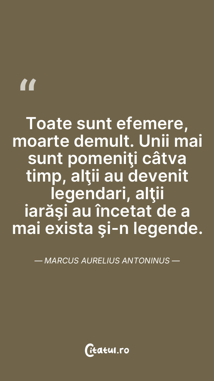 Toate sunt efemere, moarte demult. Unii mai sunt pomeniţi câtva timp, alţii au devenit legendari, alţii iarăşi au încetat de a mai exista şi-n legende. Marcus Aurelius Antoninus