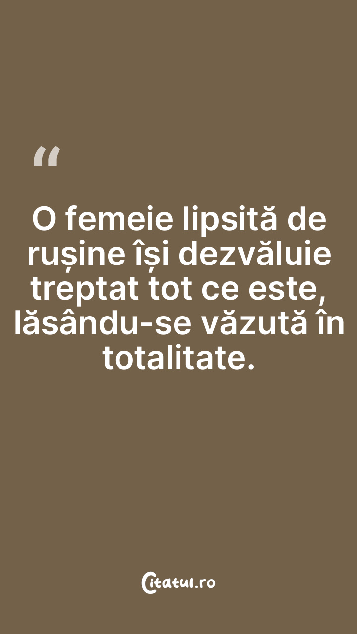 O femeie lipsită de rușine își dezvăluie treptat tot ce este, lăsându-se văzută în totalitate.