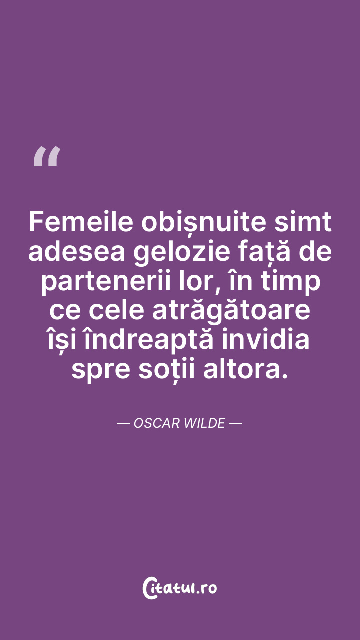 Femeile obișnuite simt adesea gelozie față de partenerii lor, în timp ce cele atrăgătoare își îndreaptă invidia spre soții altora. Oscar Wilde