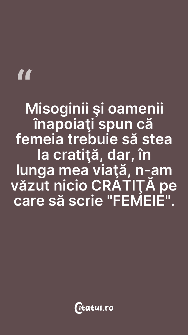 Misoginii şi oamenii înapoiaţi spun că femeia trebuie să stea la cratiţă, dar, în lunga mea viaţă, n-am văzut nicio CRATIŢĂ pe care să scrie "FEMEIE".