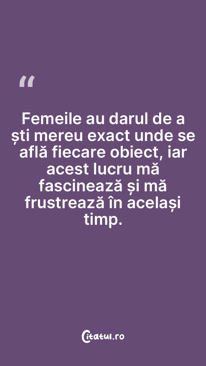 Femeile au darul de a ști mereu exact unde se află fiecare obiect, iar acest lucru mă fascinează și mă frustrează în același timp.