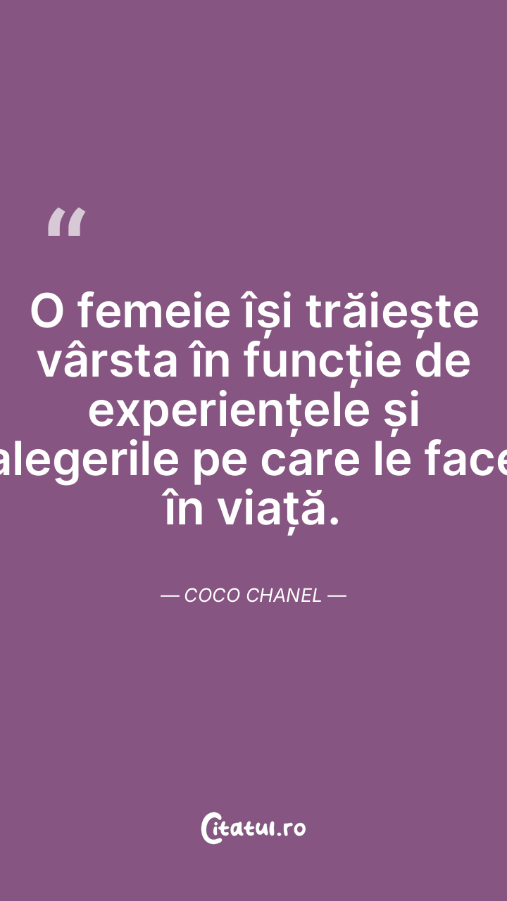 O femeie își trăiește vârsta în funcție de experiențele și alegerile pe care le face în viață. Coco Chanel