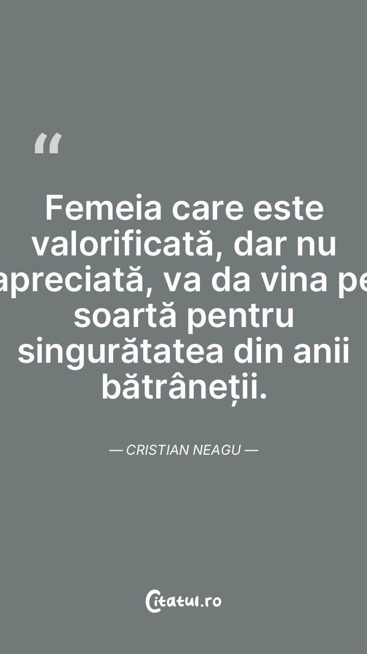 Femeia care este valorificată, dar nu apreciată, va da vina pe soartă pentru singurătatea din anii bătrâneții. Cristian Neagu