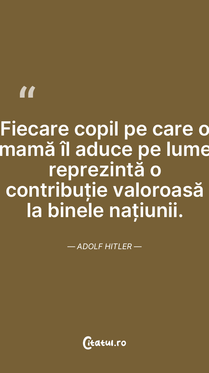 Fiecare copil pe care o mamă îl aduce pe lume reprezintă o contribuție valoroasă la binele națiunii. Adolf Hitler