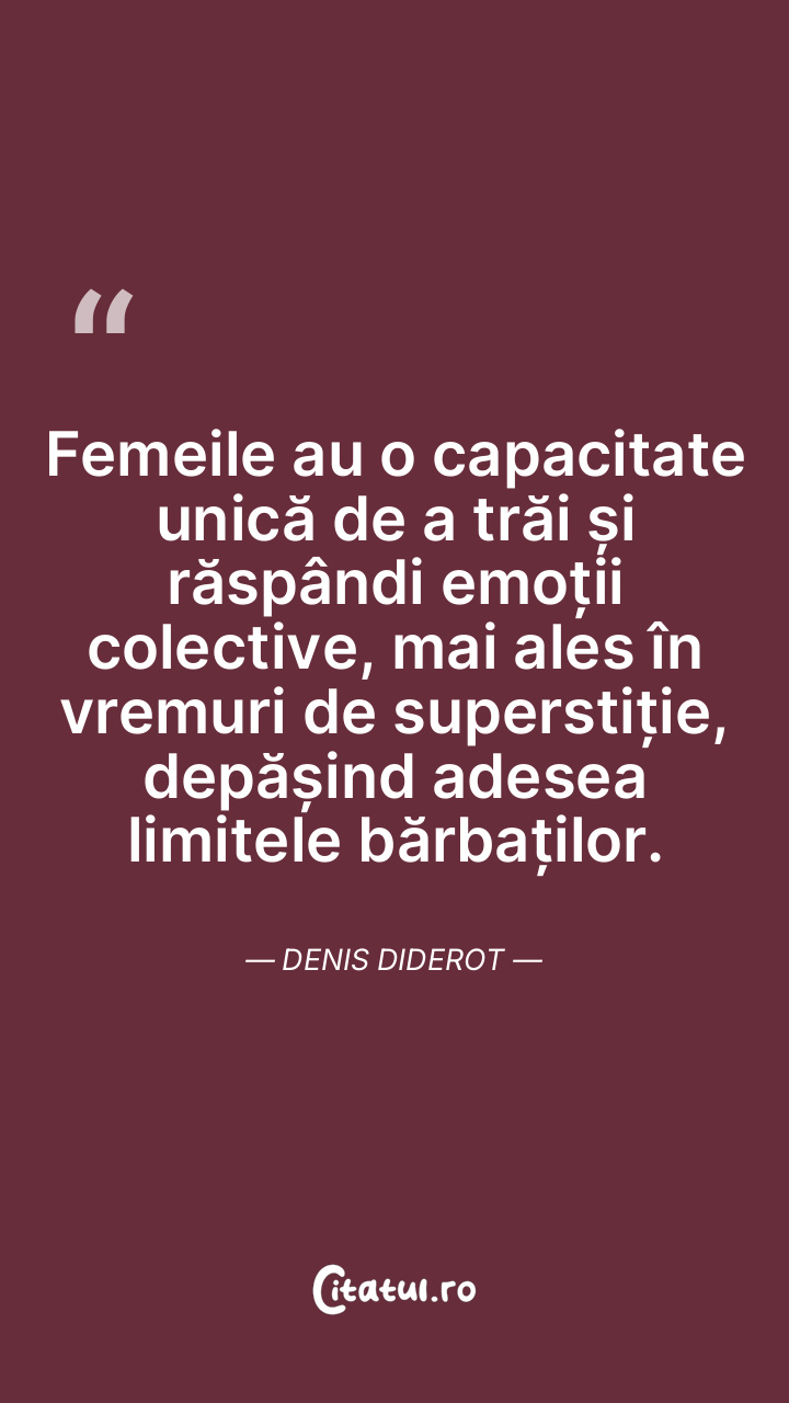 Femeile au o capacitate unică de a trăi și răspândi emoții colective, mai ales în vremuri de superstiție, depășind adesea limitele bărbaților. Denis Diderot