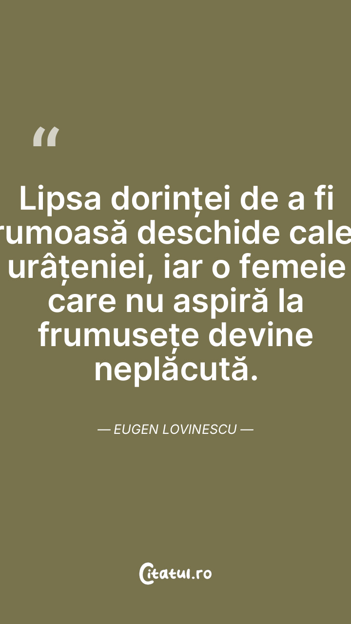 Lipsa dorinței de a fi frumoasă deschide calea urâțeniei, iar o femeie care nu aspiră la frumusețe devine neplăcută. Eugen Lovinescu