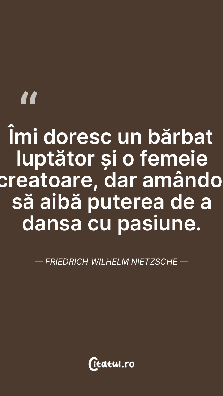 Îmi doresc un bărbat luptător și o femeie creatoare, dar amândoi să aibă puterea de a dansa cu pasiune. Friedrich Wilhelm Nietzsche