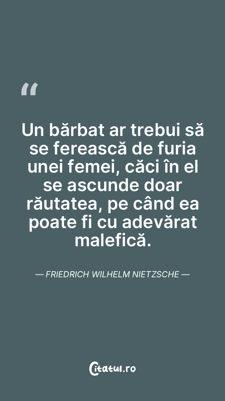 Un bărbat ar trebui să se ferească de furia unei femei, căci în el se ascunde doar răutatea, pe când ea poate fi cu adevărat malefică. Friedrich Wilhelm Nietzsche