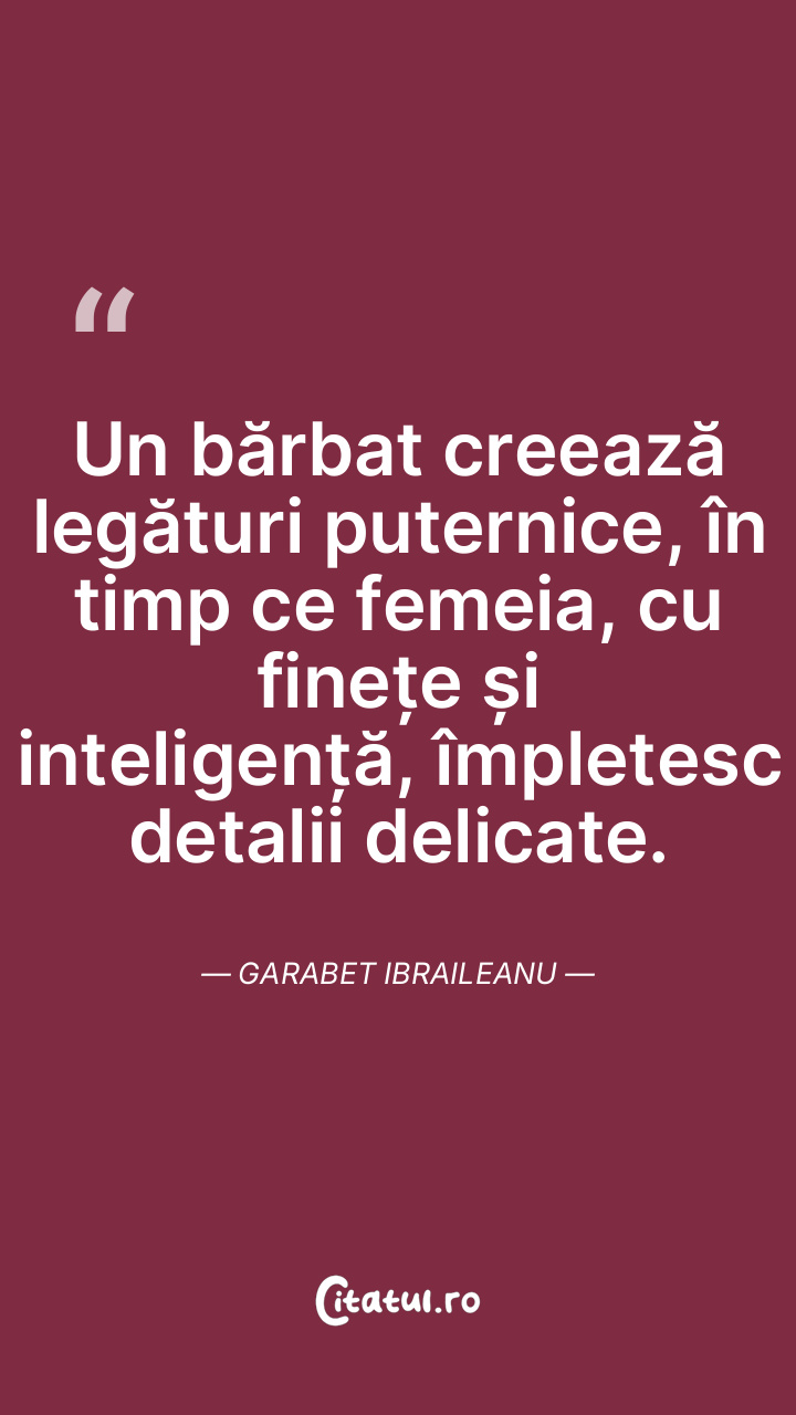 Un bărbat creează legături puternice, în timp ce femeia, cu finețe și inteligență, împletesc detalii delicate. Garabet Ibraileanu