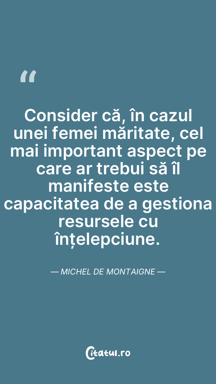 Consider că, în cazul unei femei măritate, cel mai important aspect pe care ar trebui să îl manifeste este capacitatea de a gestiona resursele cu înțelepciune. Michel de Montaigne