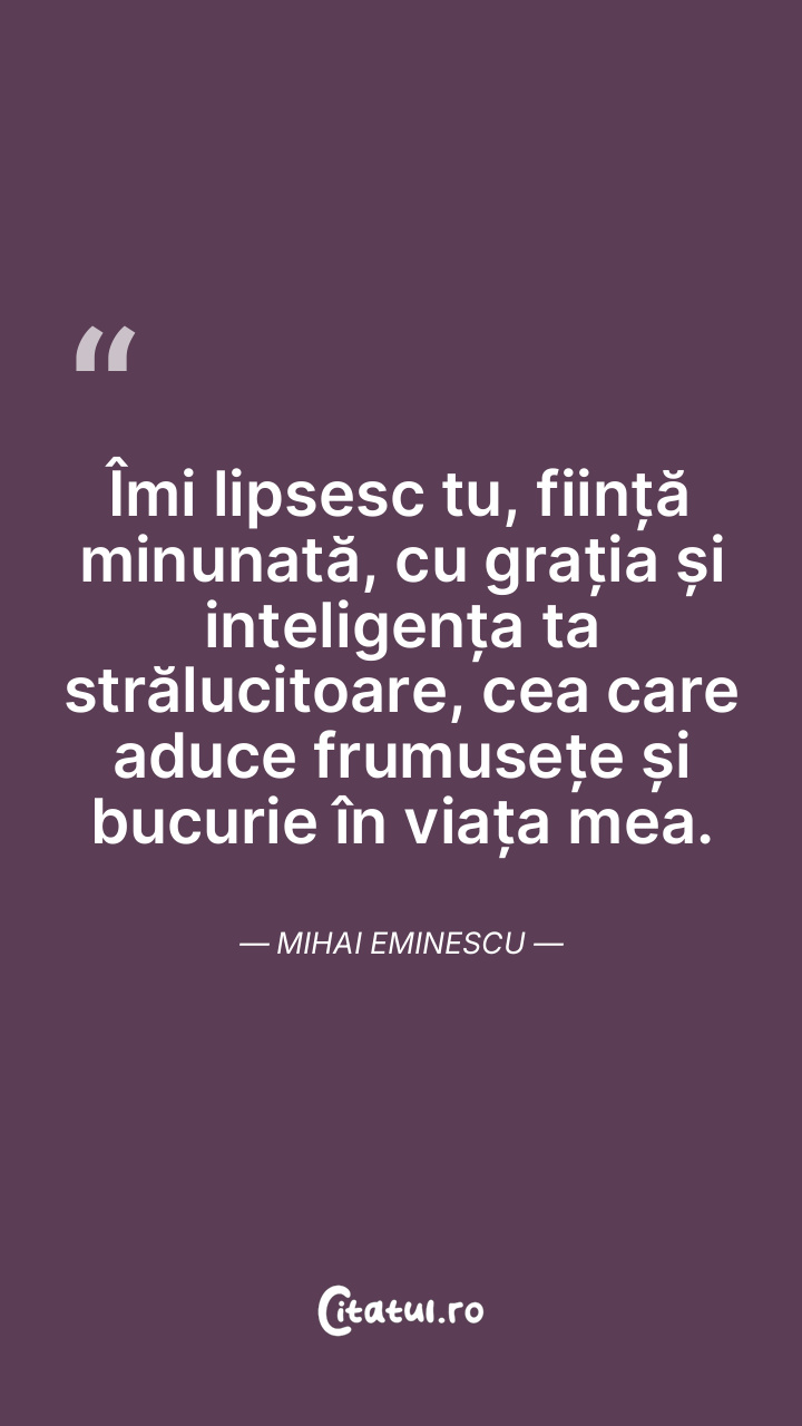 Îmi lipsesc tu, ființă minunată, cu grația și inteligența ta strălucitoare, cea care aduce frumusețe și bucurie în viața mea. Mihai Eminescu