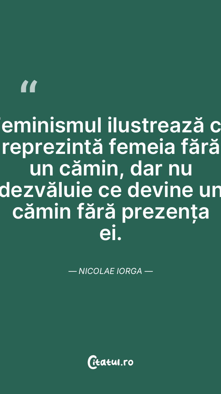 Feminismul ilustrează ce reprezintă femeia fără un cămin, dar nu dezvăluie ce devine un cămin fără prezența ei. Nicolae Iorga