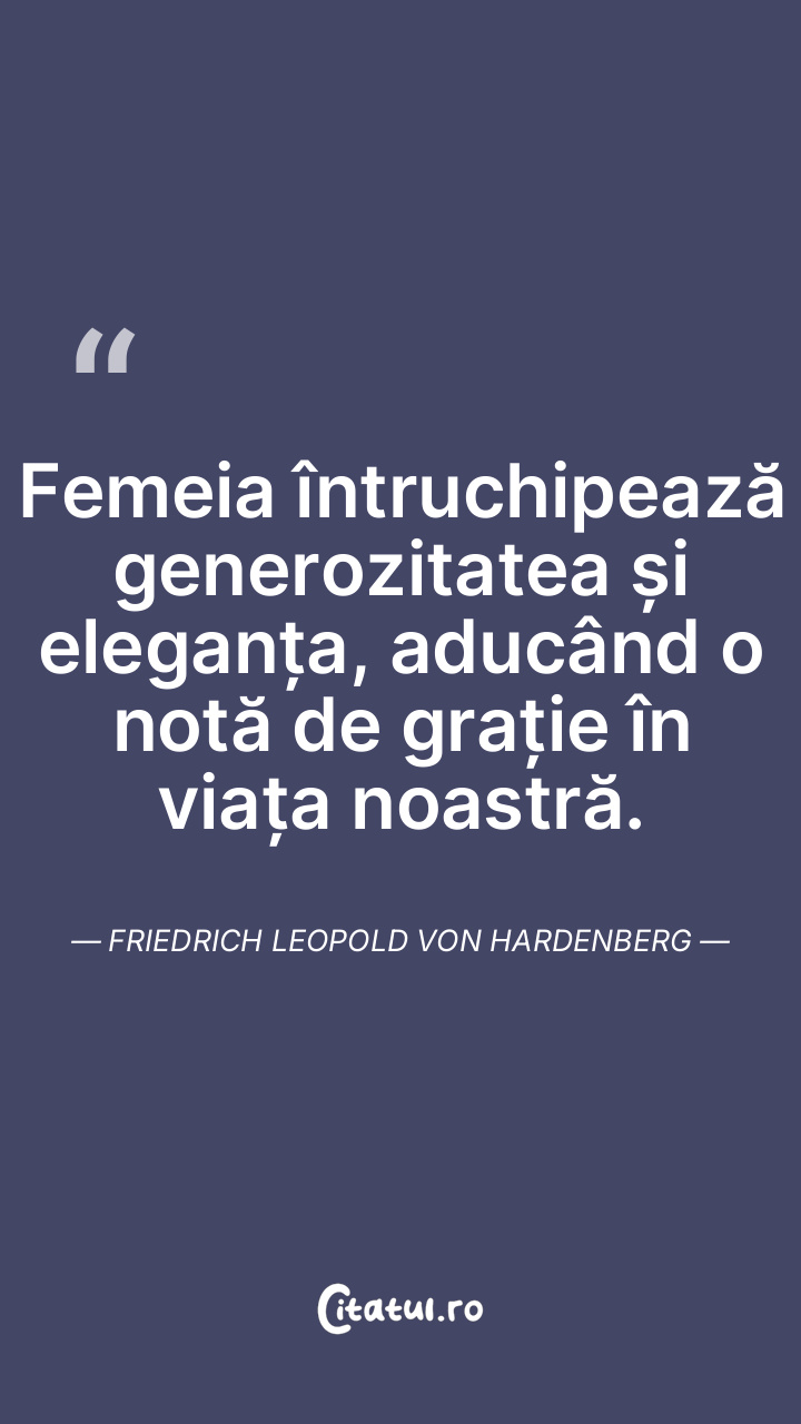 Femeia întruchipează generozitatea și eleganța, aducând o notă de grație în viața noastră. Friedrich Leopold Von Hardenberg