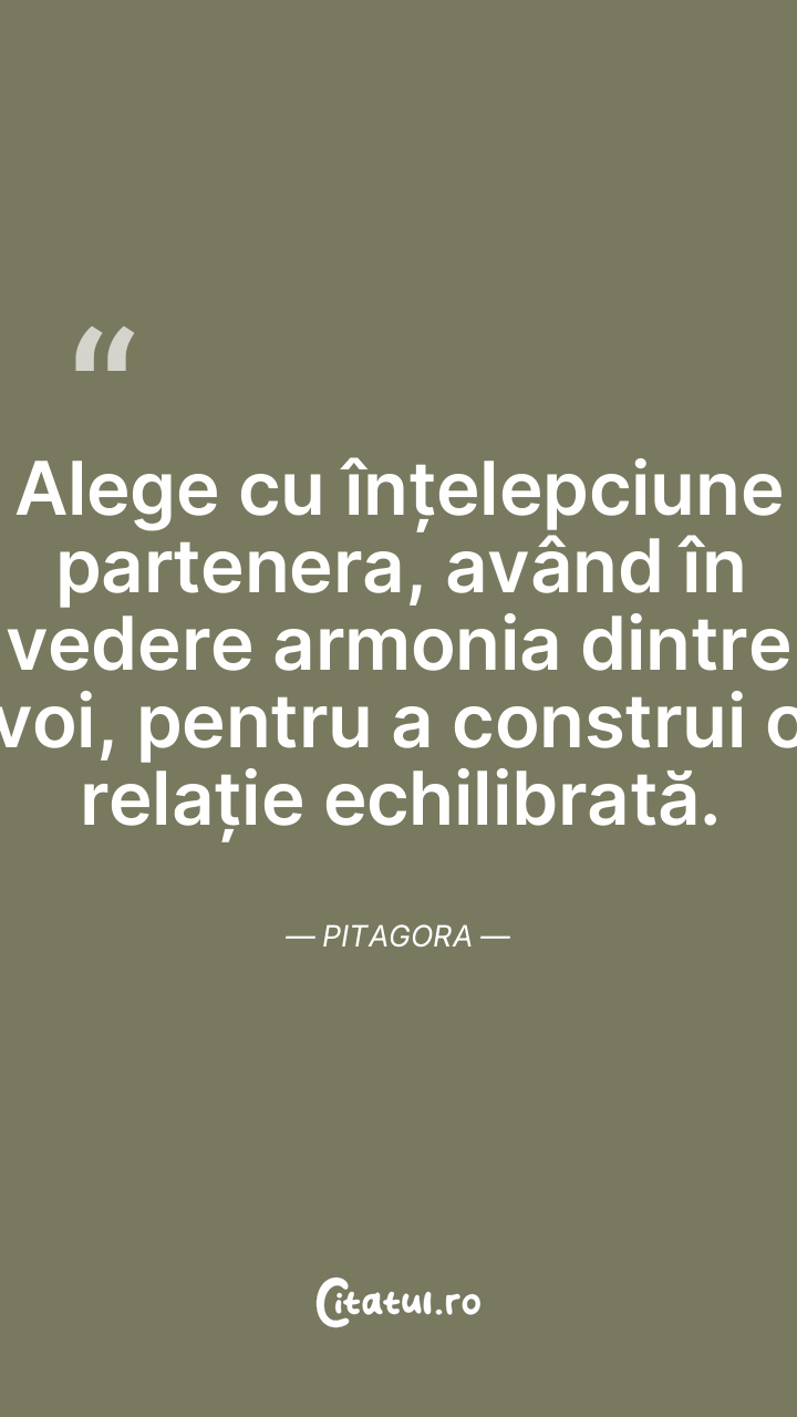 Alege cu înțelepciune partenera, având în vedere armonia dintre voi, pentru a construi o relație echilibrată. Pitagora