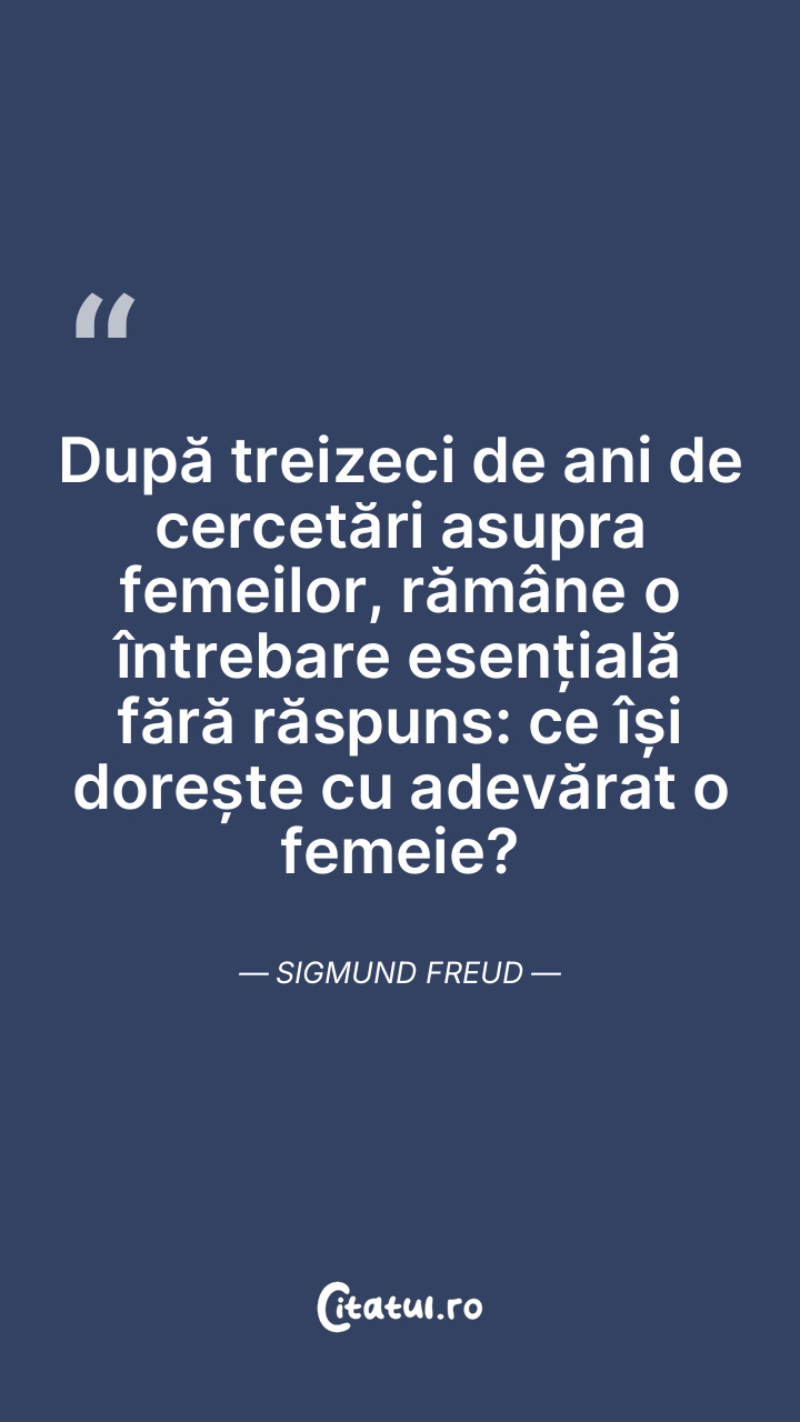 După treizeci de ani de cercetări asupra femeilor, rămâne o întrebare esențială fără răspuns: ce își dorește cu adevărat o femeie? Sigmund Freud