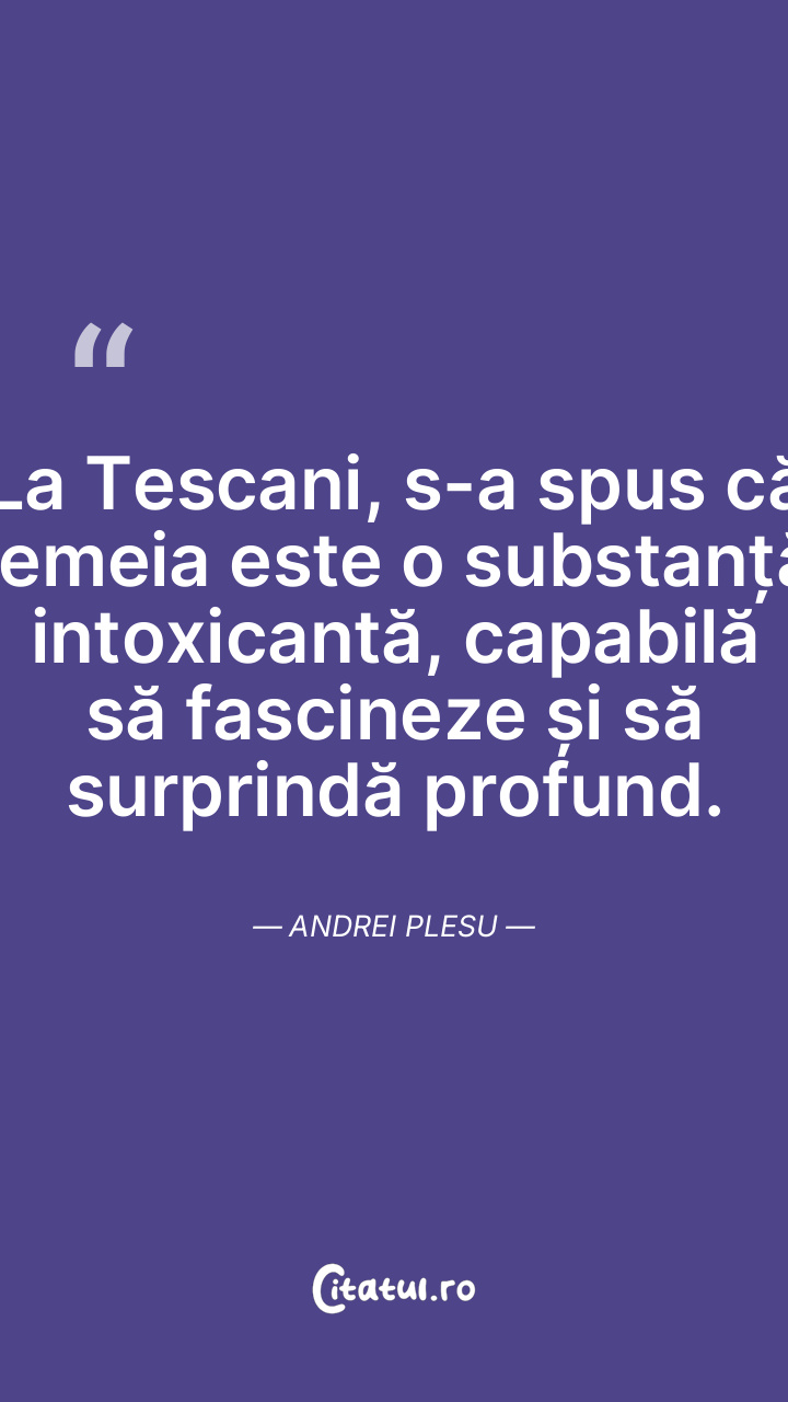 La Tescani, s-a spus că femeia este o substanță intoxicantă, capabilă să fascineze și să surprindă profund. Andrei Plesu