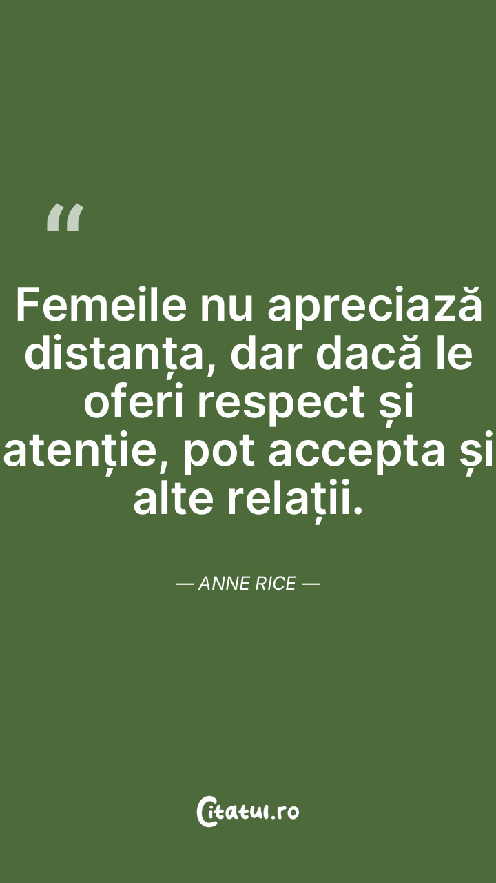 Femeile nu apreciază distanța, dar dacă le oferi respect și atenție, pot accepta și alte relații. Anne Rice