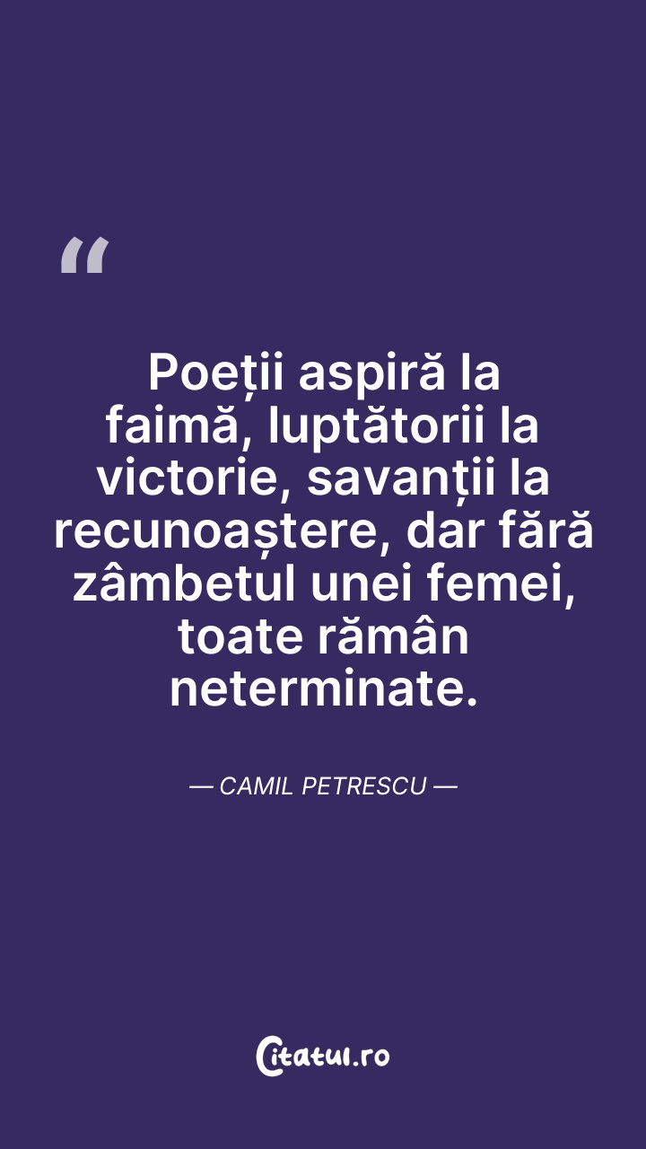 Poeții aspiră la faimă, luptătorii la victorie, savanții la recunoaștere, dar fără zâmbetul unei femei, toate rămân neterminate. Camil Petrescu