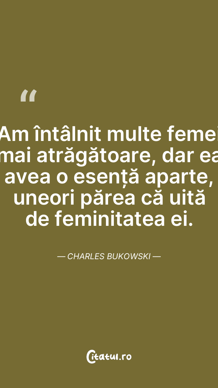 Am întâlnit multe femei mai atrăgătoare, dar ea avea o esență aparte, uneori părea că uită de feminitatea ei. Charles Bukowski