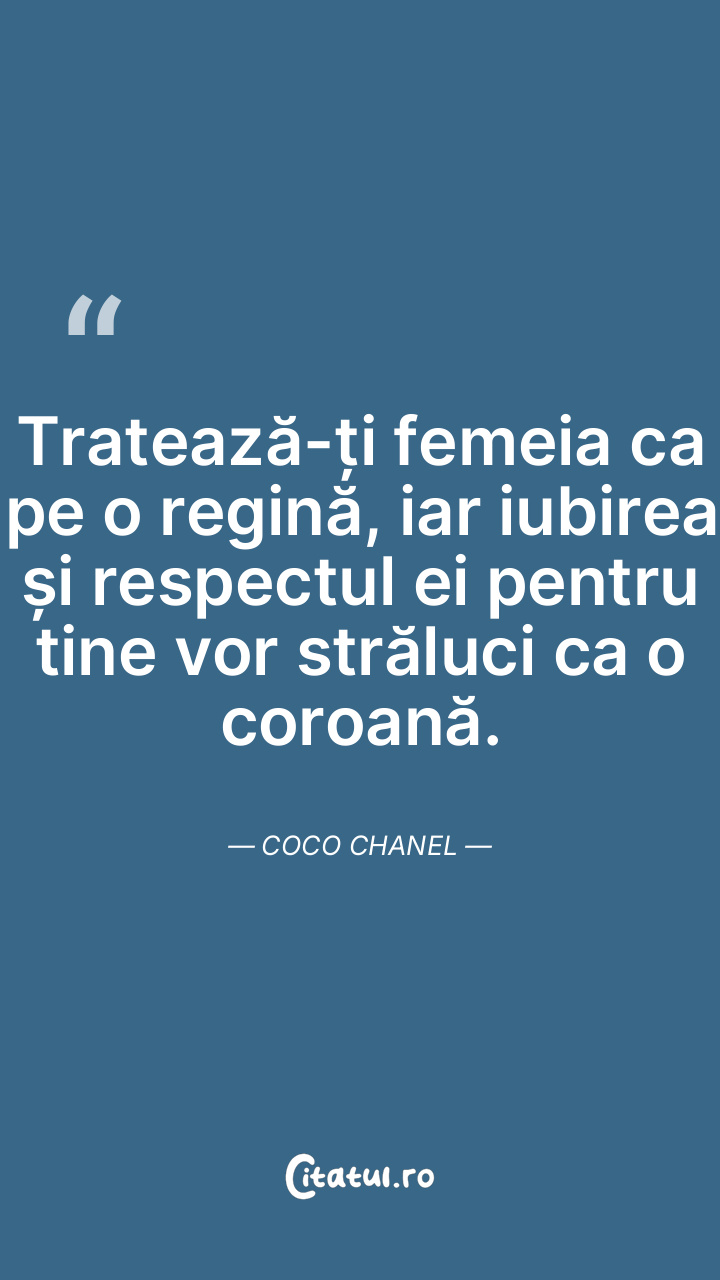 Tratează-ți femeia ca pe o regină, iar iubirea și respectul ei pentru tine vor străluci ca o coroană. Coco Chanel
