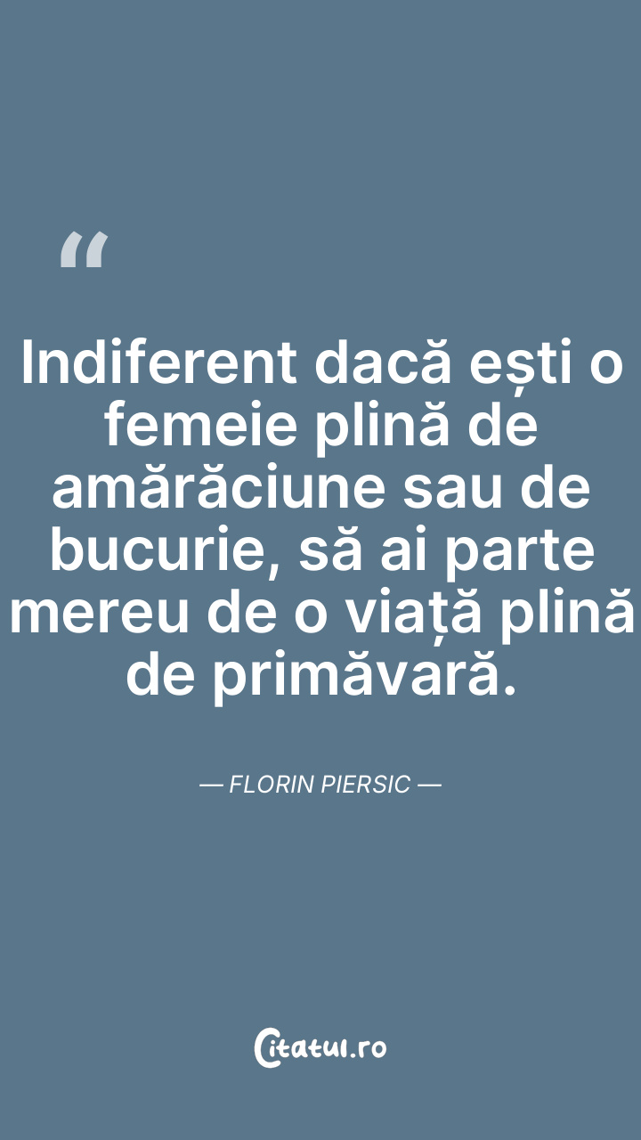 Indiferent dacă ești o femeie plină de amărăciune sau de bucurie, să ai parte mereu de o viață plină de primăvară. Florin Piersic