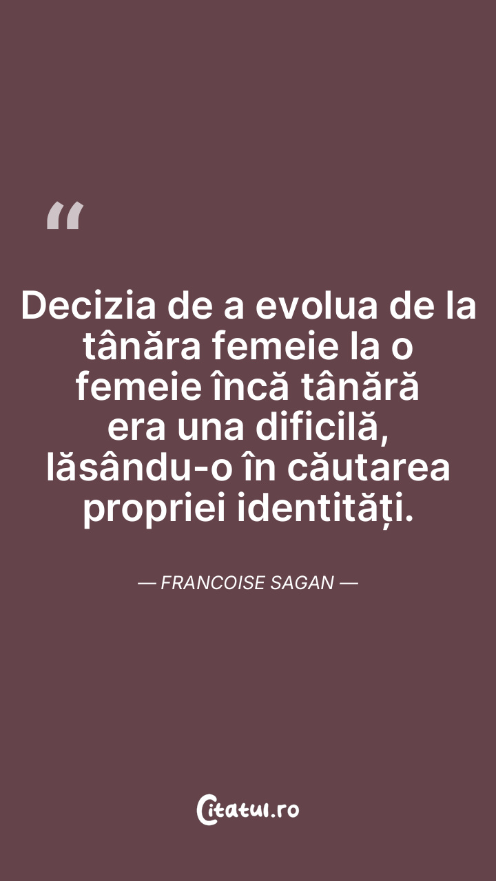 Decizia de a evolua de la tânăra femeie la o femeie încă tânără era una dificilă, lăsându-o în căutarea propriei identități. Francoise Sagan