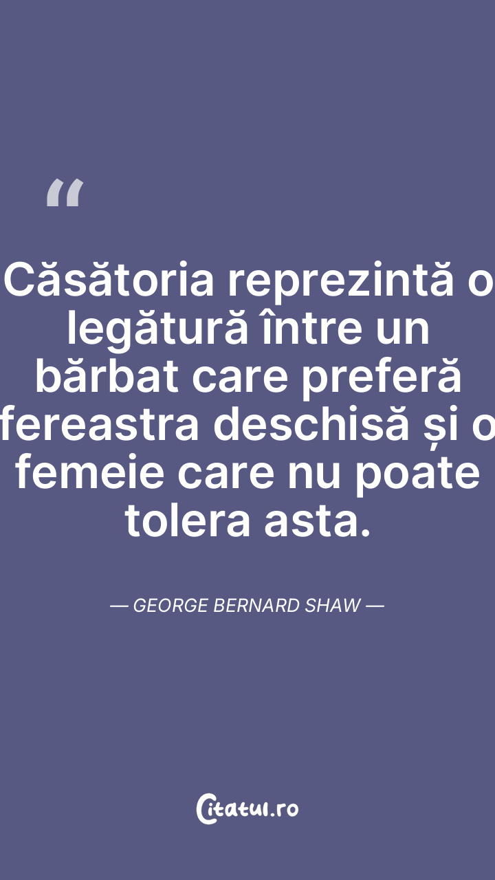 Căsătoria reprezintă o legătură între un bărbat care preferă fereastra deschisă și o femeie care nu poate tolera asta. George Bernard Shaw