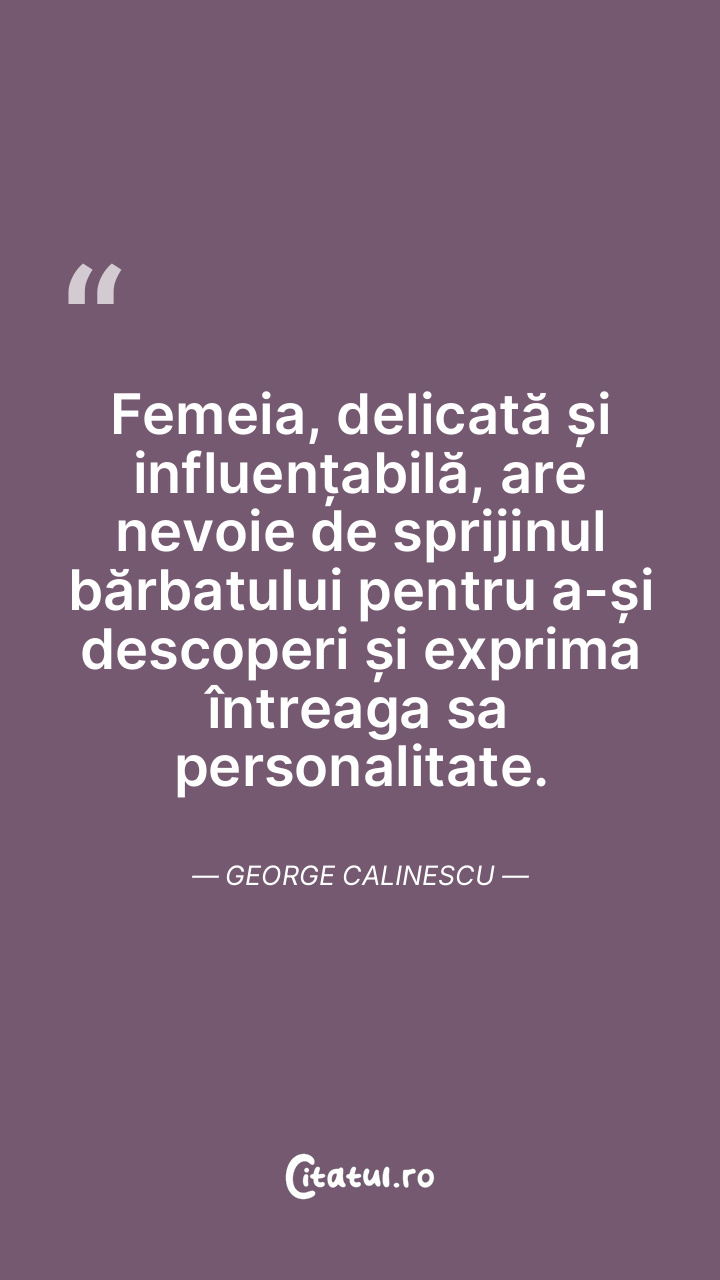 Femeia, delicată și influențabilă, are nevoie de sprijinul bărbatului pentru a-și descoperi și exprima întreaga sa personalitate. George Calinescu