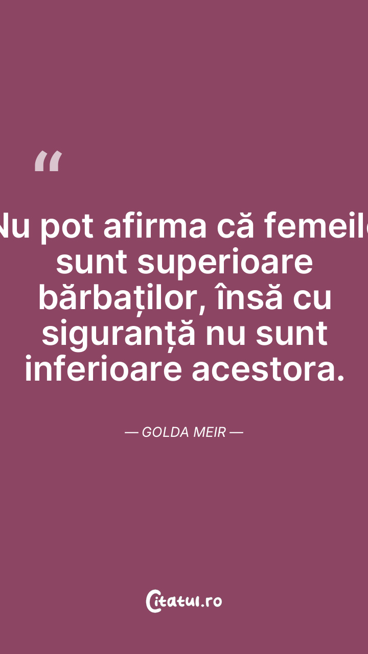 Nu pot afirma că femeile sunt superioare bărbaților, însă cu siguranță nu sunt inferioare acestora. Golda Meir