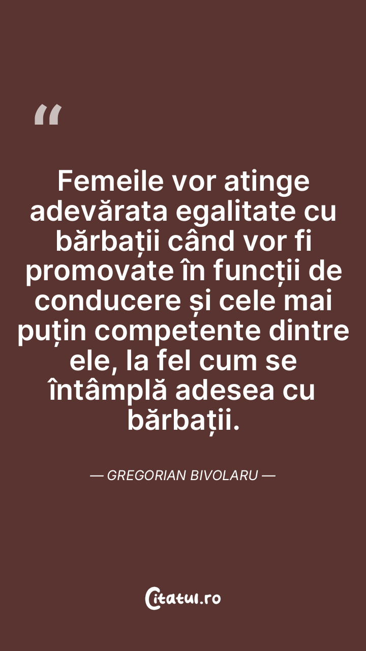 Femeile vor atinge adevărata egalitate cu bărbații când vor fi promovate în funcții de conducere și cele mai puțin competente dintre ele, la fel cum se întâmplă adesea cu bărbații. Gregorian Bivolaru