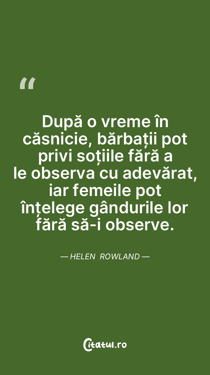 După o vreme în căsnicie, bărbații pot privi soțiile fără a le observa cu adevărat, iar femeile pot înțelege gândurile lor fără să-i observe. Helen Rowland