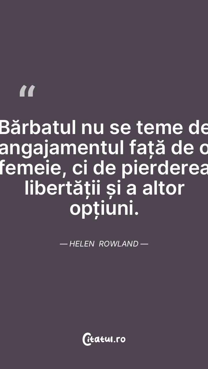 Bărbatul nu se teme de angajamentul față de o femeie, ci de pierderea libertății și a altor opțiuni. Helen Rowland