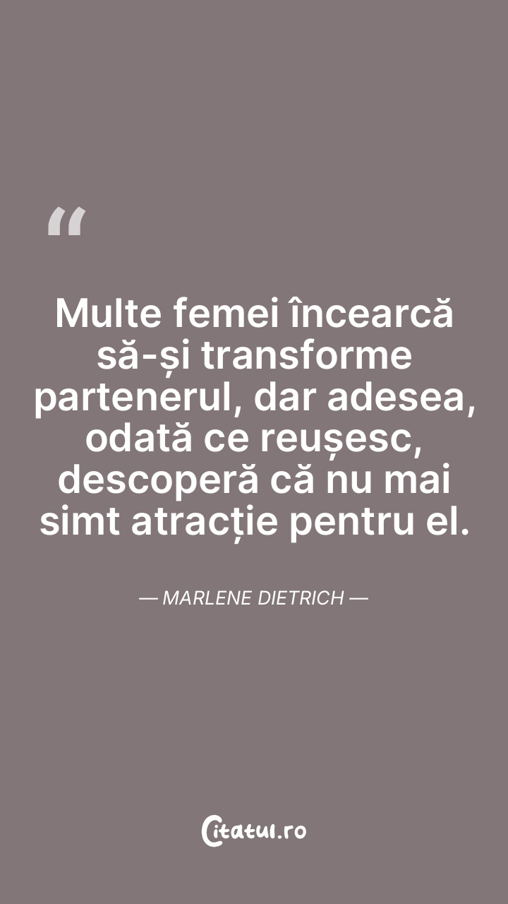 Multe femei încearcă să-și transforme partenerul, dar adesea, odată ce reușesc, descoperă că nu mai simt atracție pentru el. Marlene Dietrich