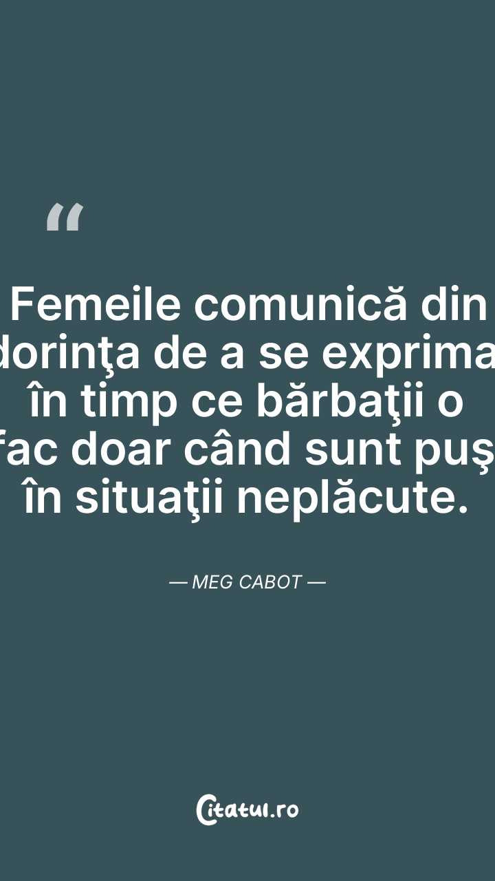 Femeile comunică din dorinţa de a se exprima, în timp ce bărbaţii o fac doar când sunt puşi în situaţii neplăcute. Meg Cabot