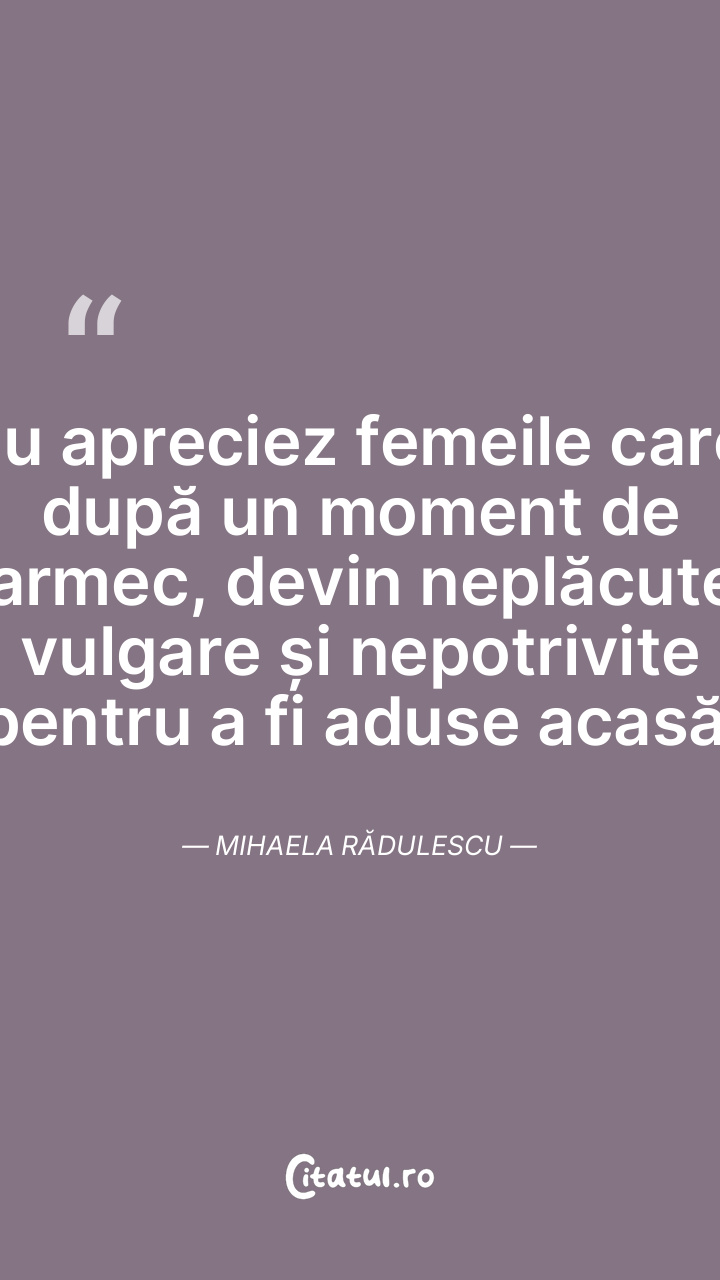 Nu apreciez femeile care, după un moment de farmec, devin neplăcute, vulgare și nepotrivite pentru a fi aduse acasă. Mihaela Rădulescu