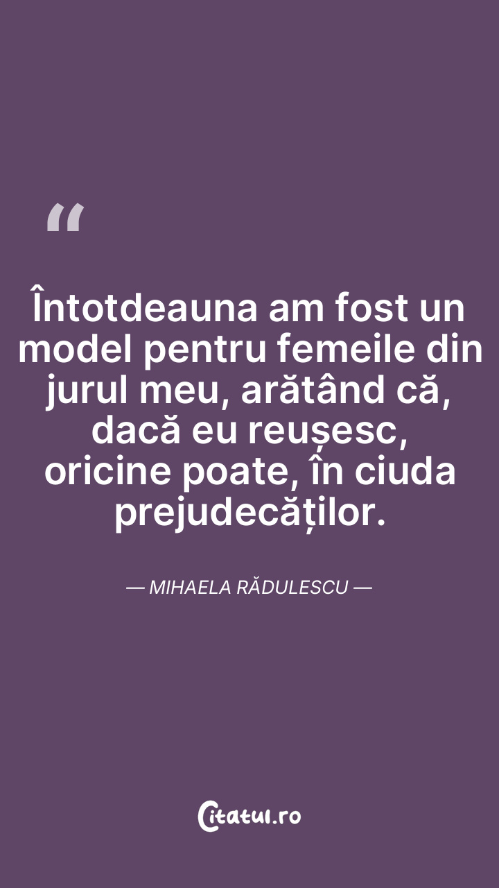 Întotdeauna am fost un model pentru femeile din jurul meu, arătând că, dacă eu reușesc, oricine poate, în ciuda prejudecăților. Mihaela Rădulescu