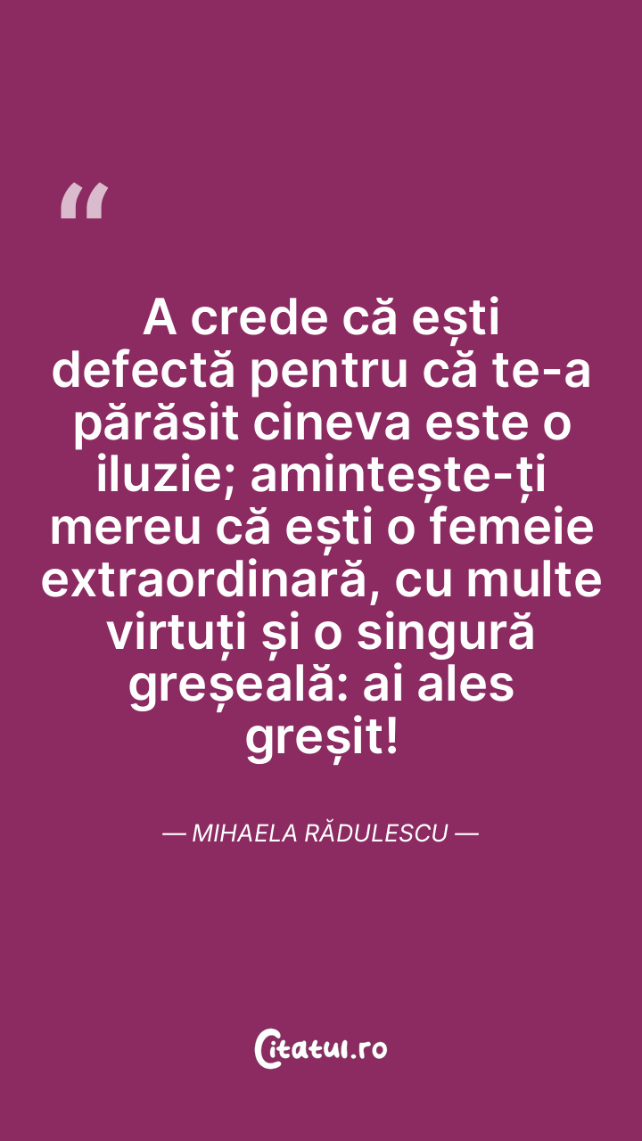 A crede că ești defectă pentru că te-a părăsit cineva este o iluzie; amintește-ți mereu că ești o femeie extraordinară, cu multe virtuți și o singură greșeală: ai ales greșit! Mihaela Rădulescu