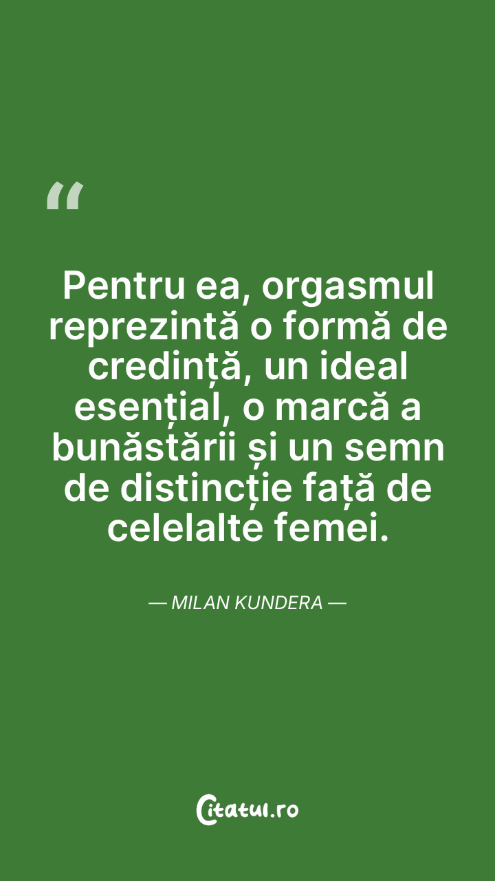 Pentru ea, orgasmul reprezintă o formă de credință, un ideal esențial, o marcă a bunăstării și un semn de distincție față de celelalte femei. Milan Kundera