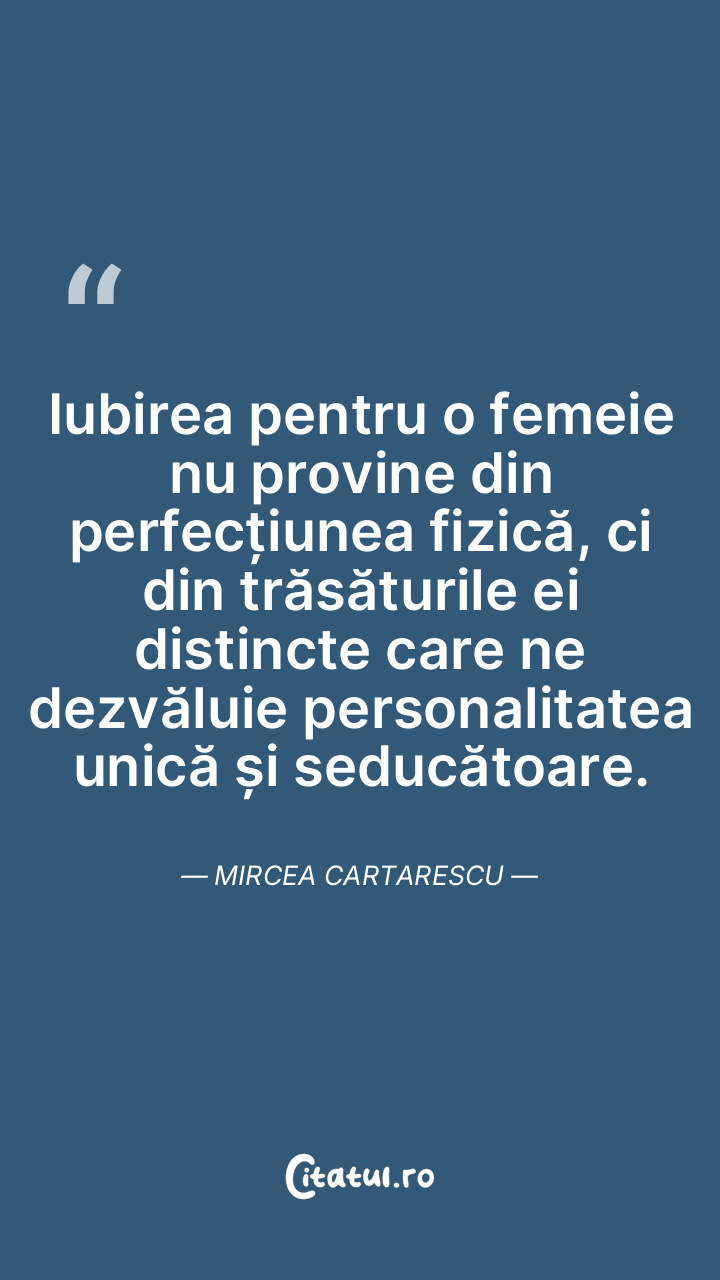 Iubirea pentru o femeie nu provine din perfecțiunea fizică, ci din trăsăturile ei distincte care ne dezvăluie personalitatea unică și seducătoare. Mircea Cartarescu