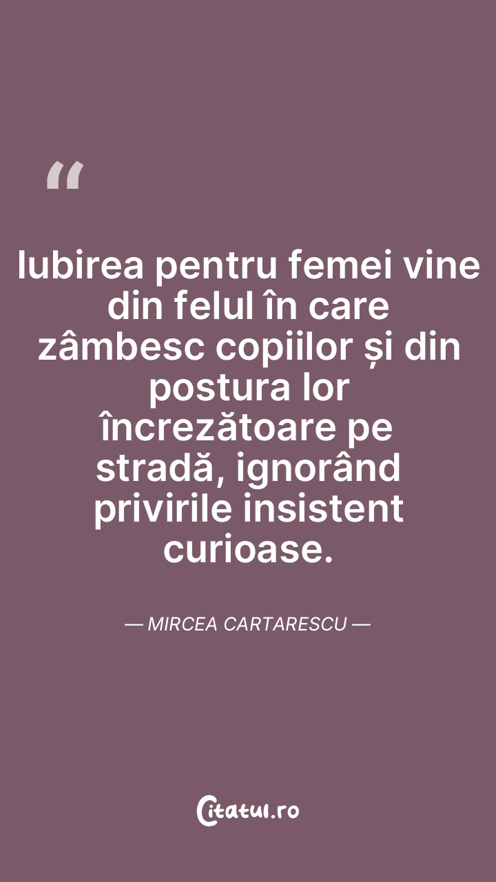 Iubirea pentru femei vine din felul în care zâmbesc copiilor și din postura lor încrezătoare pe stradă, ignorând privirile insistent curioase. Mircea Cartarescu