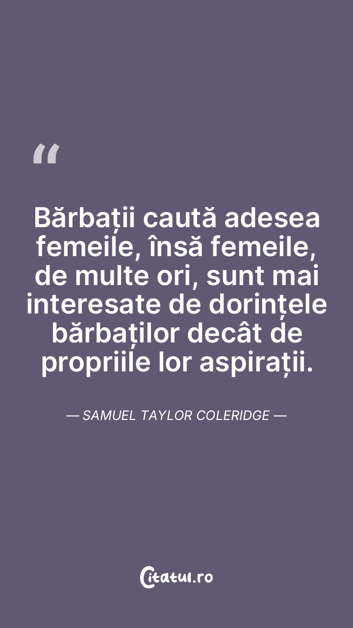 Bărbații caută adesea femeile, însă femeile, de multe ori, sunt mai interesate de dorințele bărbaților decât de propriile lor aspirații. Samuel Taylor Coleridge