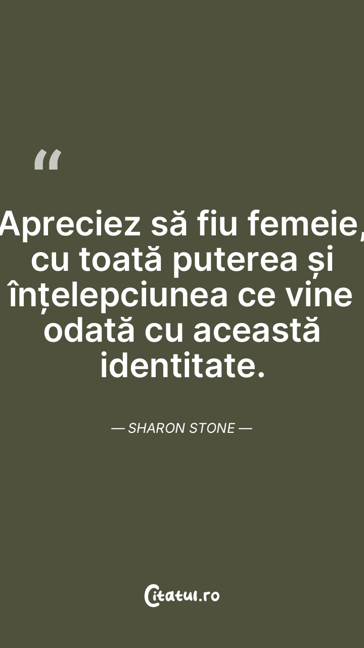 Apreciez să fiu femeie, cu toată puterea și înțelepciunea ce vine odată cu această identitate. Sharon Stone