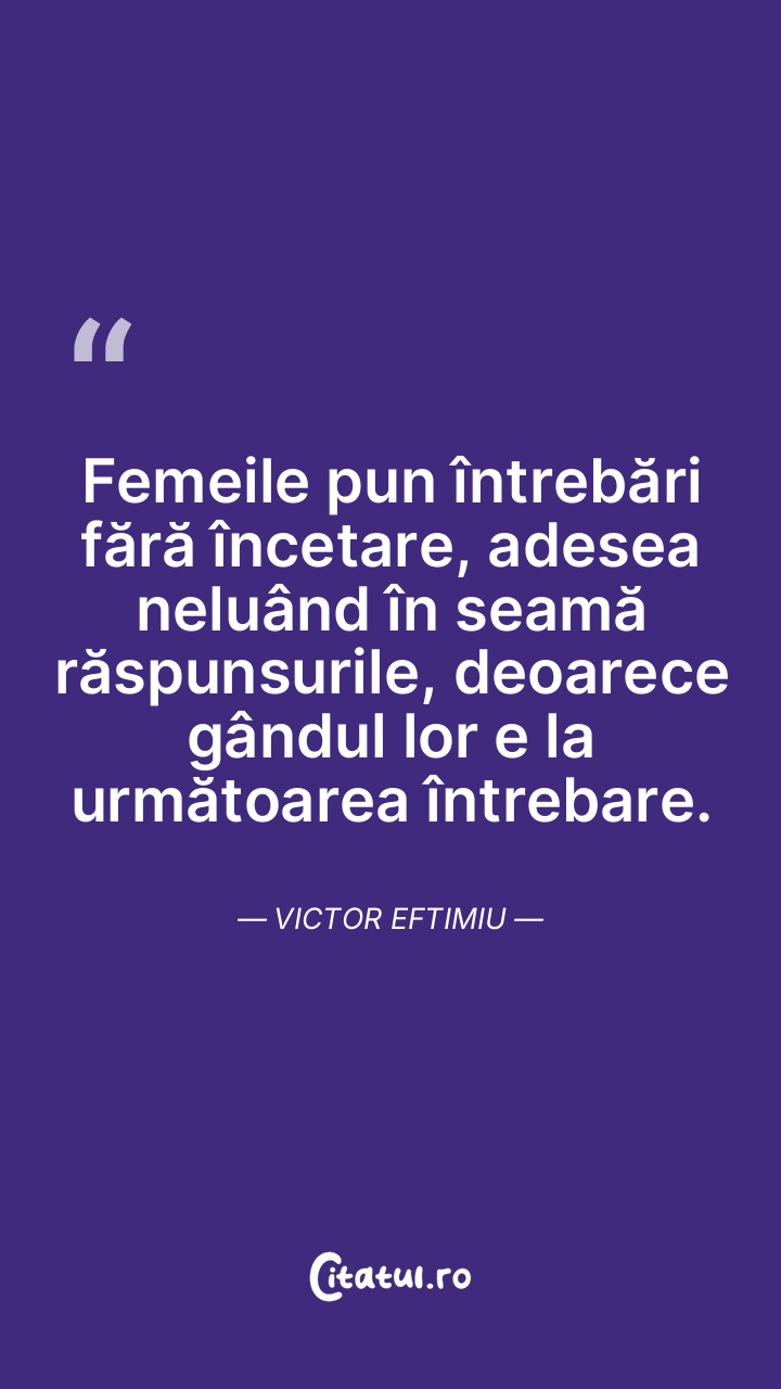 Femeile pun întrebări fără încetare, adesea neluând în seamă răspunsurile, deoarece gândul lor e la următoarea întrebare. Victor Eftimiu