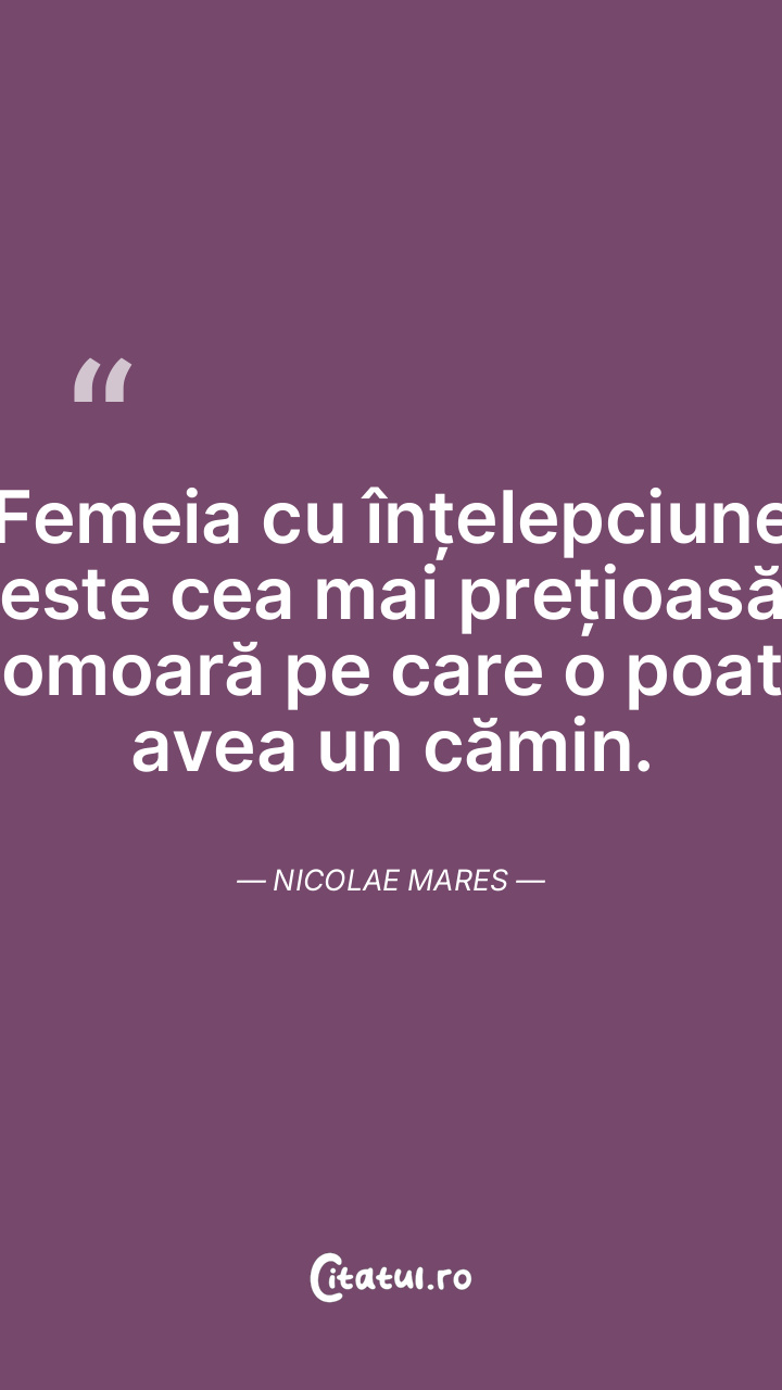 Femeia cu înțelepciune este cea mai prețioasă comoară pe care o poate avea un cămin. Nicolae Mares