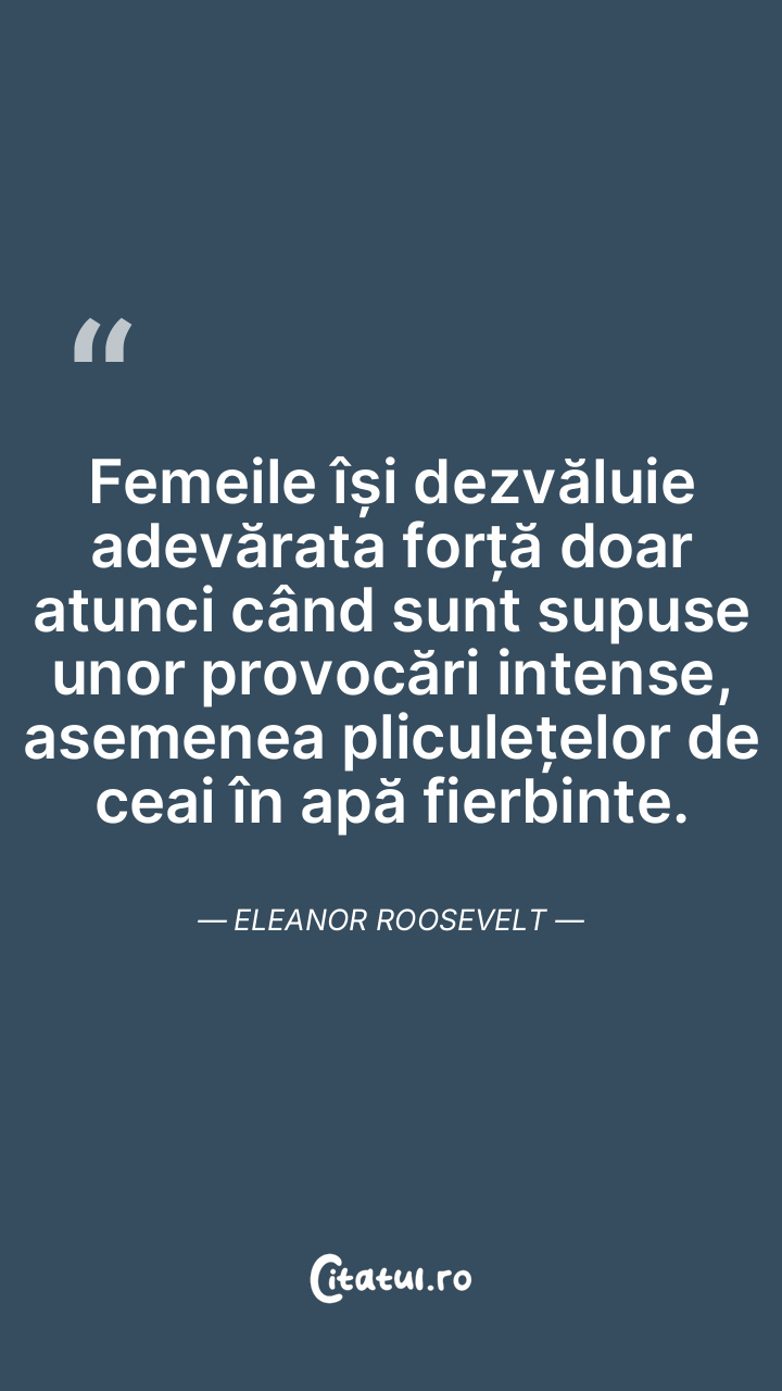 Femeile își dezvăluie adevărata forță doar atunci când sunt supuse unor provocări intense, asemenea pliculețelor de ceai în apă fierbinte. Eleanor Roosevelt