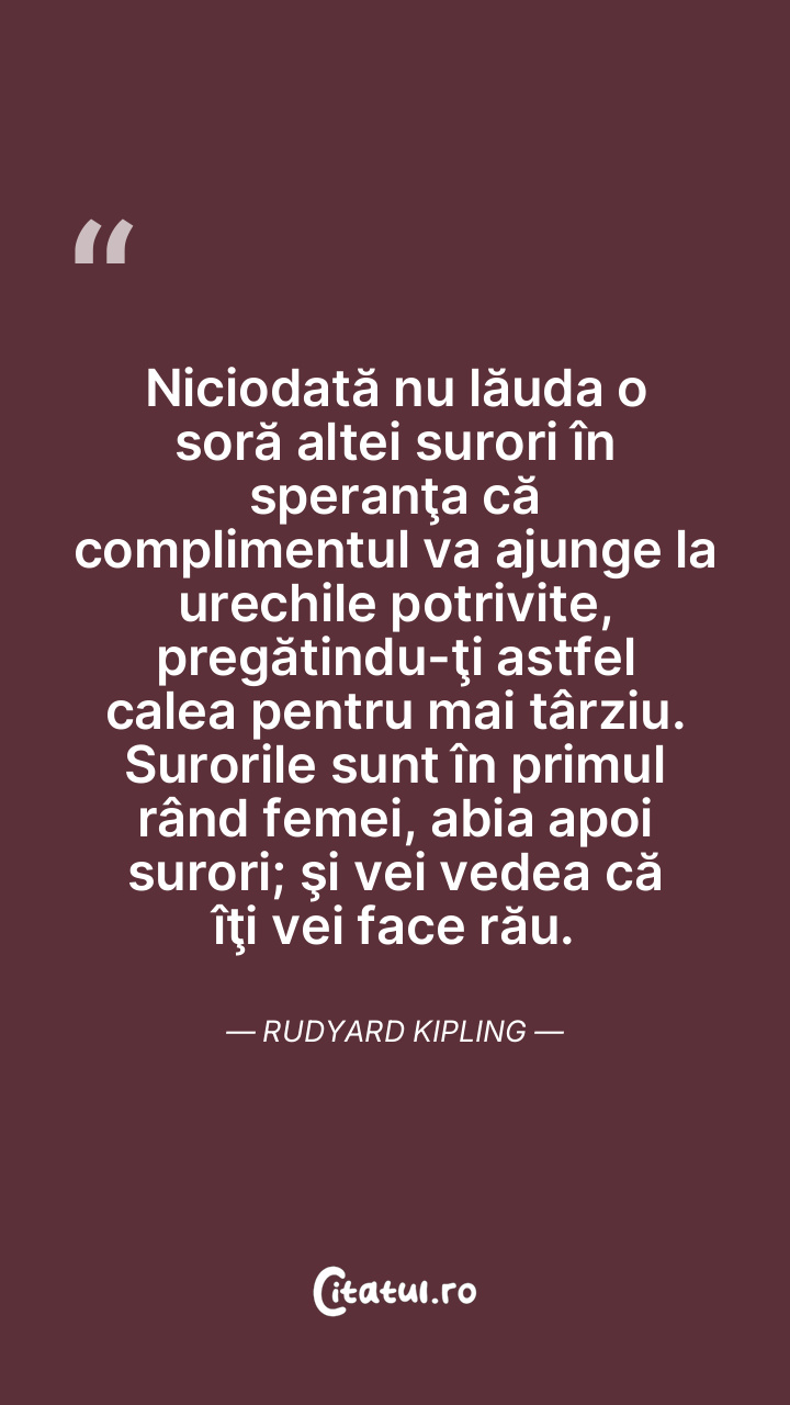 Niciodată nu lăuda o soră altei surori în speranţa că complimentul va ajunge la urechile potrivite, pregătindu-ţi astfel calea pentru mai târziu. Surorile sunt în primul rând femei, abia apoi surori; şi vei vedea că îţi vei face rău. Rudyard Kipling