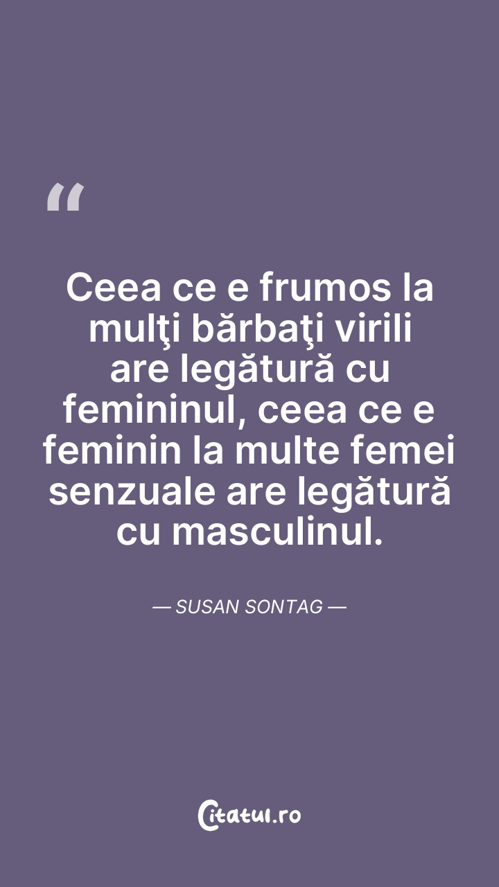 Ceea ce e frumos la mulţi bărbaţi virili are legătură cu femininul, ceea ce e feminin la multe femei senzuale are legătură cu masculinul. Susan Sontag