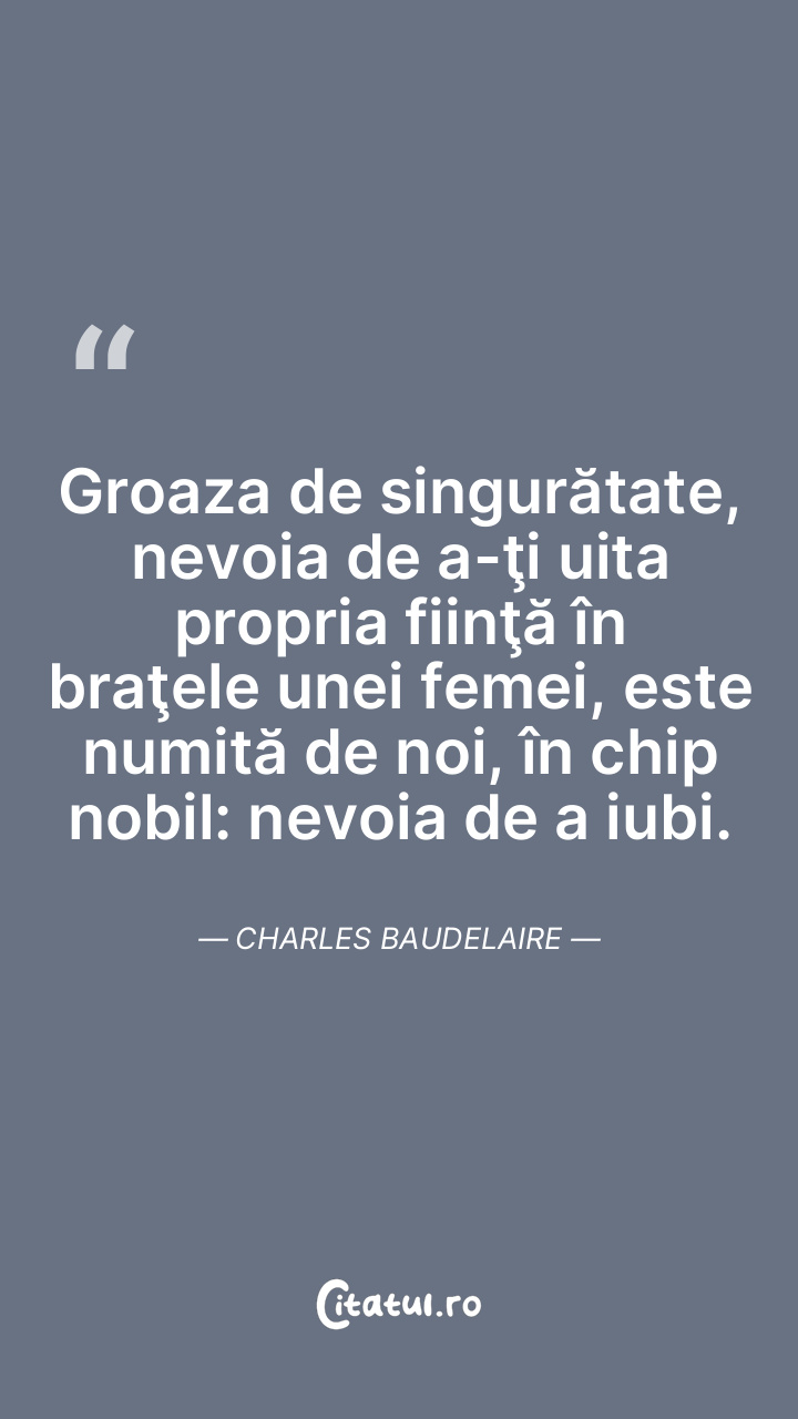 Groaza de singurătate, nevoia de a-ţi uita propria fiinţă în braţele unei femei, este numită de noi, în chip nobil: nevoia de a iubi. Charles Baudelaire